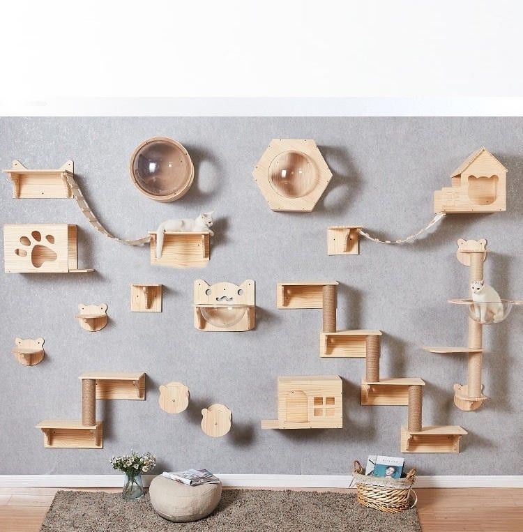 Espaço interno: Uma combinação de esteira rolante fixada na parede do gato da mobília de madeira do animal de estimação é apropriada para espaços interiores da casa e fornece uma área colorida do entretenimento para seu gato. A cremalheira de escalada do gato na parede não pega o espaço, o espaço de salvamento e a criação de uma área de atividade especial para o gato.