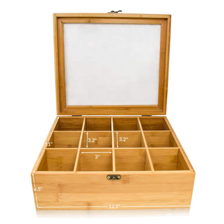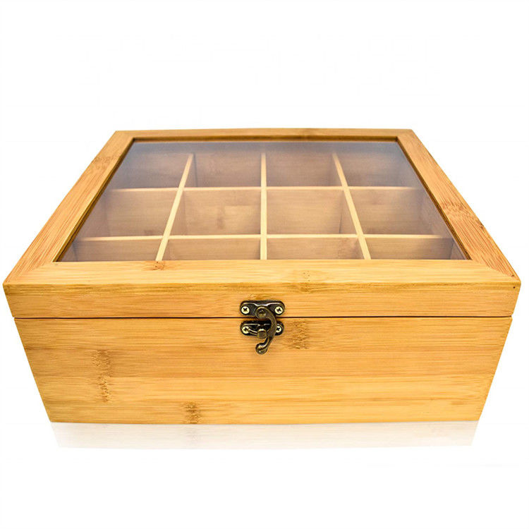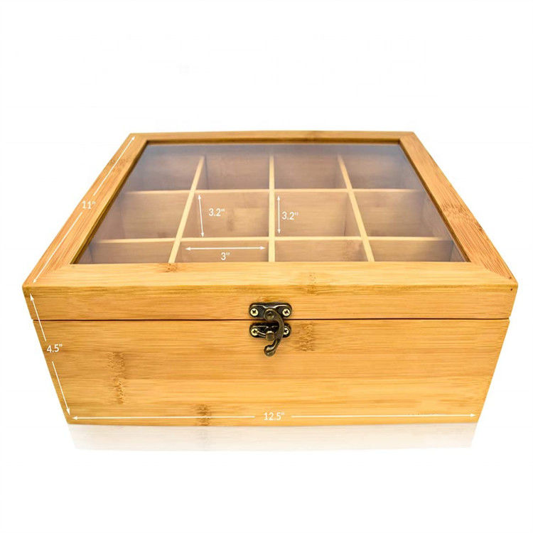 do organizador contínuo feito sob encomenda natural da caixa de presente do saquinho de chá do armazenamento de 12 compartimentos caixa de madeira de bambu do chá com tampa transparente