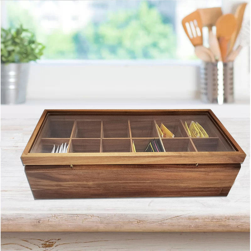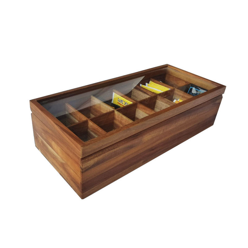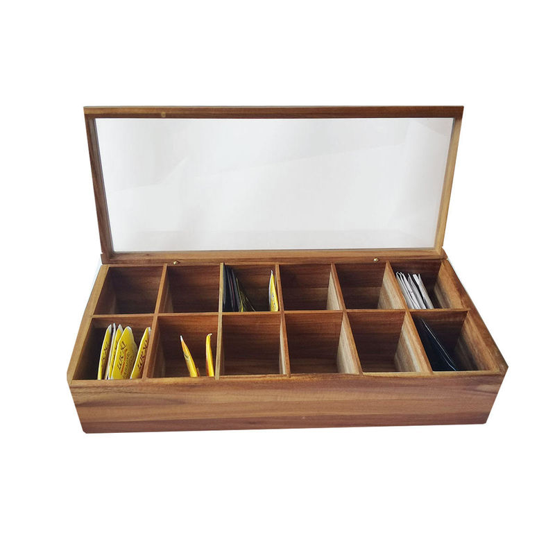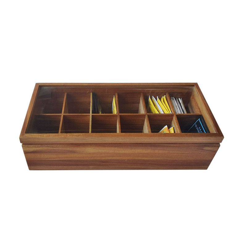 Organizador de madeira contínuo arquivado With Glass Lid do armazenamento de Tea Bag Box do organizador da caixa 12 compartimentos lisos ajustáveis